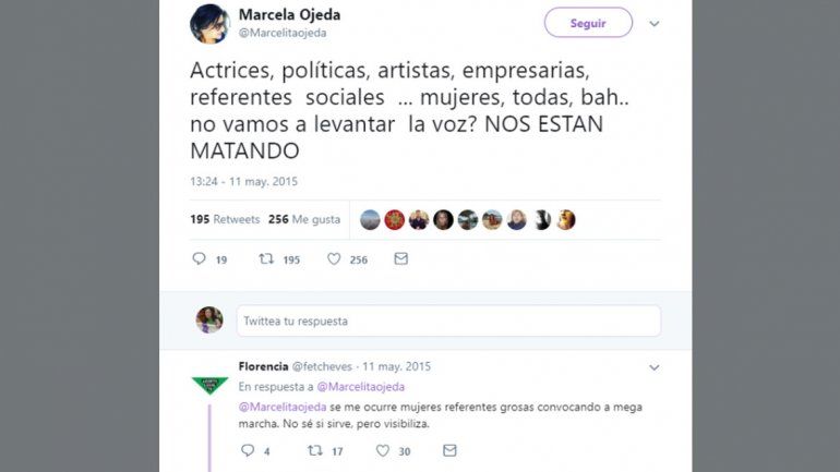 "Actrices, políticas, artistas, empresarias, referentes sociales... mujeres, todas, bah... no vamos a levantar la voz? NOS ESTÁN MATANDO", lanzó en un tuit de forma impulsiva la periodista Marcela Ojeda el 11 de mayo de 2015, un día después de que la adolescente santafesina de 14 años -que estaba embarazada- fue encontrada asesinada en el patio de la casa de la familia de su novio de 16 años.