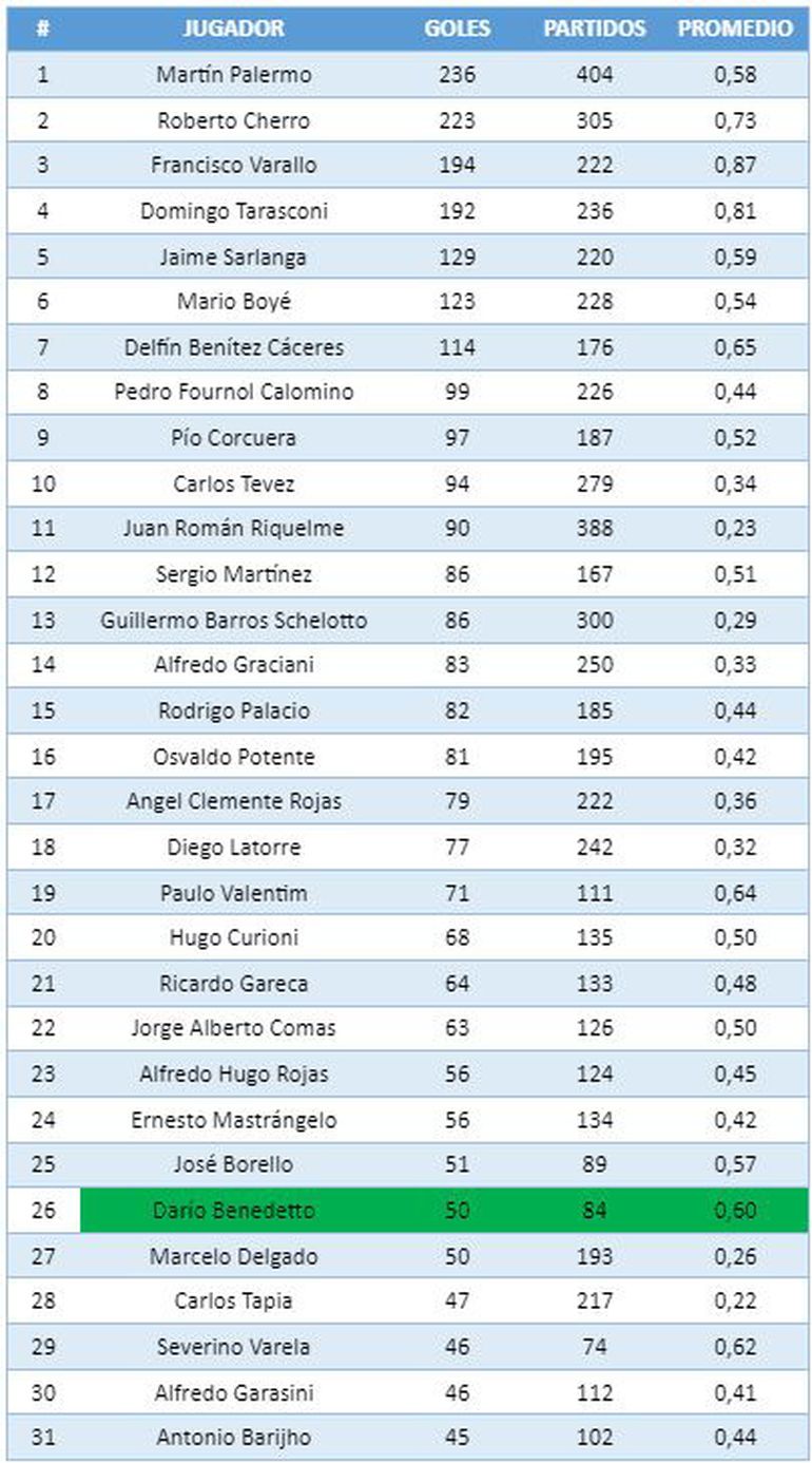 Las presas más cercanas que tiene ahora Benedetto son José Borello (51), Ernesto Mastrángelo (56), y Alfredo Hugo Rojas (56). Cabe recordar que el máximo goleador de la historia de Boca es Martín Palermo con 236 tantos. El podio lo completan Roberto Cherro (223) y Francisco Varallo (194).