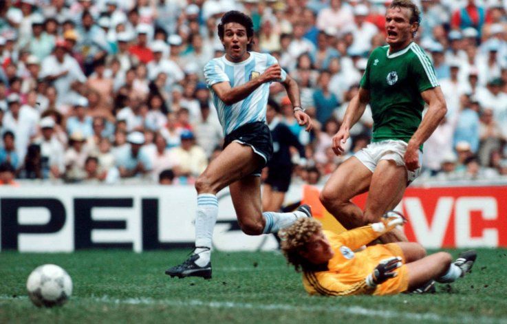 ¿Y Maradona? Apareció pero menos que en los partidos anteriores. Había dejado la vara altísima y aunque de Diego podía esperarse todo, contra Alemania no logró marcar la superioridad que había mostrado contra los ingleses y los belgas porque, además, cada vez que quiso pararse con la pelota al pie, entre el mal estado del campo de juego, la firmeza en la persecución de los alemanes y alguna infracción que le cortaba el envión, todo se le hizo muy trabado. Pero como de los genios solo se esperan genialidades, hubo que aguardar hasta los últimos minutos, el ratito final de un partido que se había complicado, porque del 2-0 claro pasamos a un 2-2 que dificultaba el futuro, para que apareciera en todo su esplendor con un pase profundo sensacional que fue la llave del éxito. Aunque la puerta, esta vez, no la abrió él solo…
