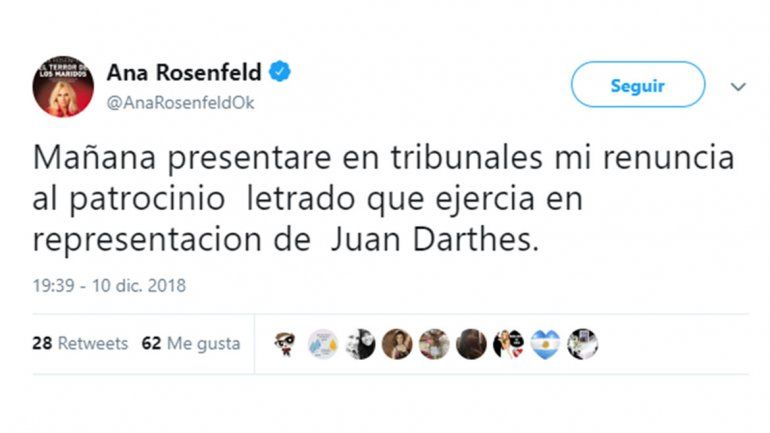"Mañana presentare en tribunales mi renuncia al patrocinio letrado que ejercía en representación de Juan Darthes", escribió en Twitter la abogada que hace unos meses generó polémica al defender al también cantante de tangos al señalar que "nadie puede venir ahora a inventar ni a decir cosas que no pudieron haber quedado grabadas en ese momento".