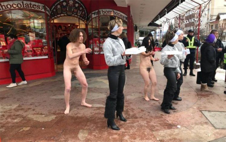 Completamente desnudas, seis personas se concentraron en el Centro Cívico y luego caminaron por las primeras tres cuadras de calle Mitre, llamando la atención de los turistas y vecinos que circulaban por la céntrica arteria. La temperatura no superaba los cero grados.