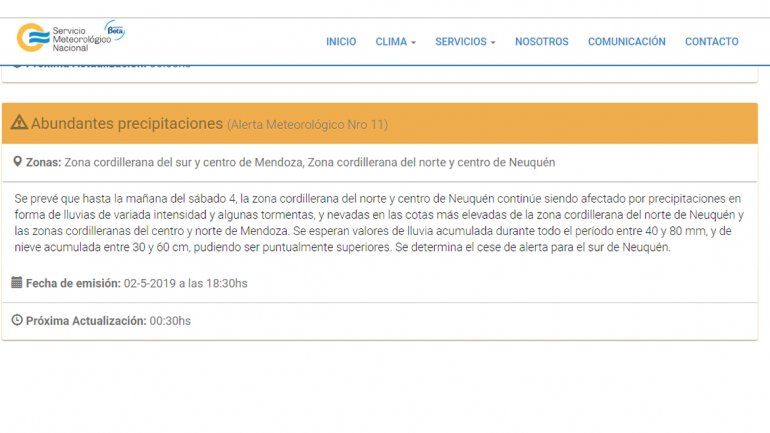 En tanto, desde el Servicio Meteorológico Nacional emitieron un alerta por Abundantes precipitaciones para diferentes sitios: zona cordillerana del sur y centro de Mendoza, zona cordillerana del norte y centro de Neuquén.