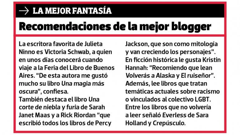 A los 8 años, Julieta Ninno descubrió el fascinante mundo de la literatura a través de Harry Potter, la genial obra fantástica escrita por la británica J. K. Rowling. Ese deslumbramiento es el que trata de volcar desde hace más de cinco años en su blog Mi Universo Literario Writer, donde reseña los libros que lee, especialmente para entusiasmar a otros jóvenes. Luego de dos años de ser finalista, el 27 de abril recibió el premio a la mejor blogger otorgado por la Feria Internacional del Libro de Buenos Aires.