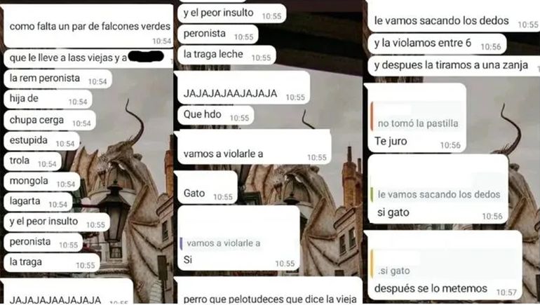 “Que se las lleve a las viejas y a L.”, añade el mismo individuo. Luego de escribir una catarata de insultos dirigidos a su compañera, generando la risa de los integrantes del grupo, otro de ellos propone: “Vamos a violarla a L.”. “La violamos entre los 6 y después la tiramos a una zanja”, agrega uno más.