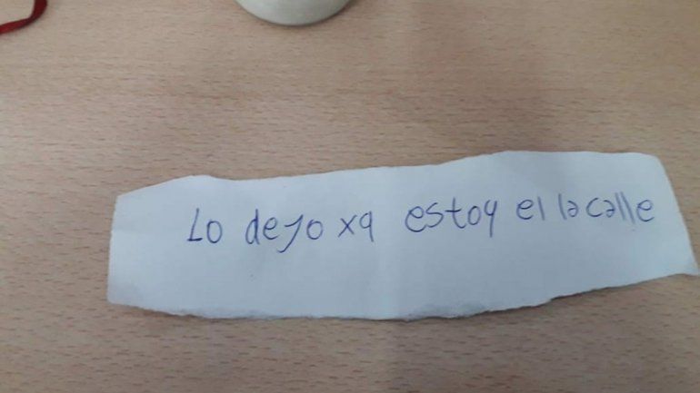 "Lo dejo porque estoy en la calle", señalaba un mensaje escrito en papel que fue hallado esta mañana junto al niño que, de acuerdo a lo informado por fuentes policiales, se encuentra en buen estado de salud.