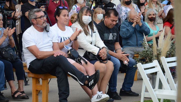 Marlene Velásquez, ex pareja de Quiroga y madre de sus hijas, se acomodó en primera fila del acto junto a Ayelén, Ailín, Julieta y Rodrigo, hijos del ex intendente, y Helena, su nieta. Detrás de ellos estuvieron familiares, amigos y una gran cantidad de vecinos que se acercaron a recordar a Pechi.