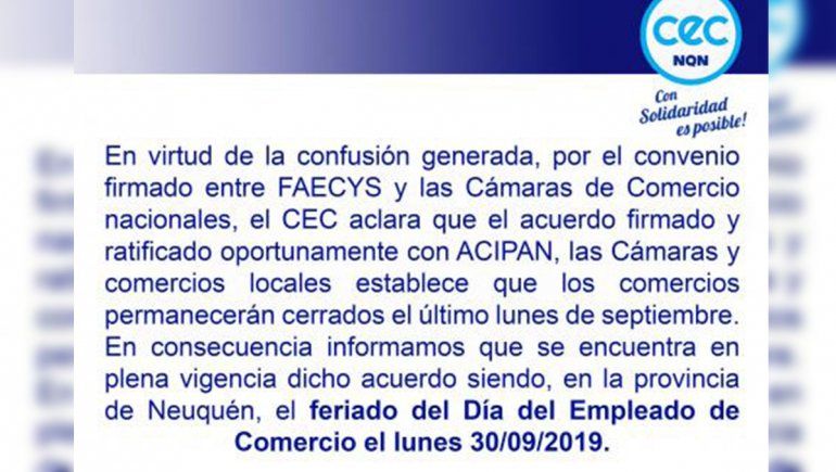 El secretario gremial del Centro de Empelados de Comercio, Ramón Rodríguez, confirmó que se cumplirá con el acuerdo firmado con ACIPAN, las Cámaras y comercios locales en el que se especificó que se goza del día feriado, por el día festivo, el último día del mes de septiembre.