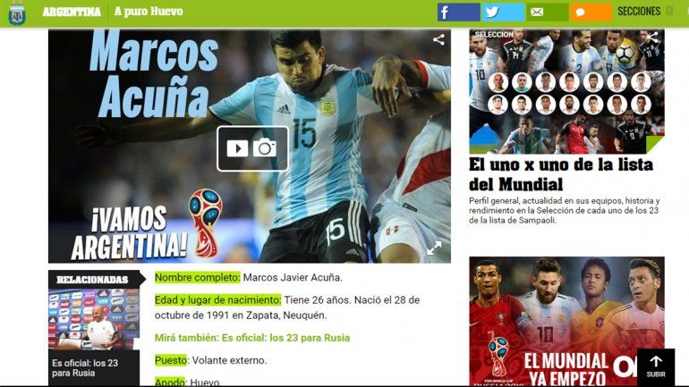 Marcos "Huevo" Acuña está entre los 23 seleccionados por el director técnico Jorge Sampaoli para estar en el Mundial Rusia 2018. El diario deportivo Olé lanzó una sección especial sobre la Selección con toda la actualidad de los jugadores y novedades del certamen internacional.