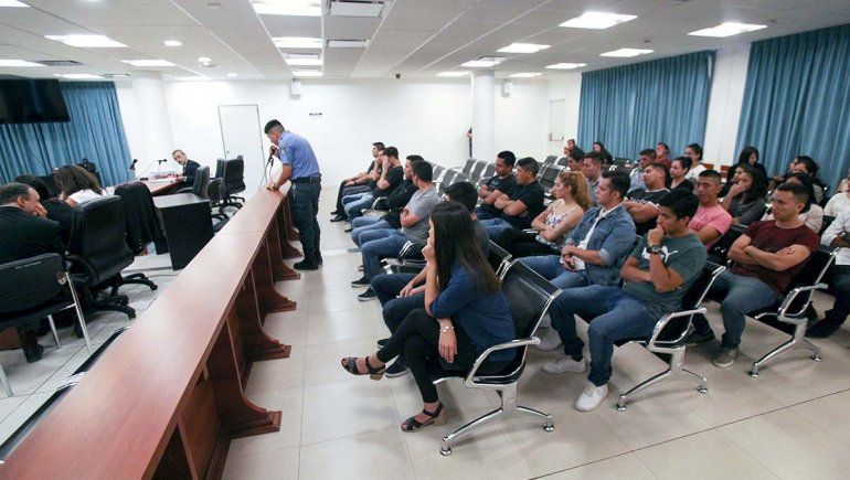 La concurrida audiencia se realizó en la sala de juicio por jurados, que agotó la mitad de su capacidad solo con la presencia de los efectivos que fueron acusados durante la jornada. Si bien dos de los 35 policías estuvieron ausentes (con justificación), también se les formuló cargos.