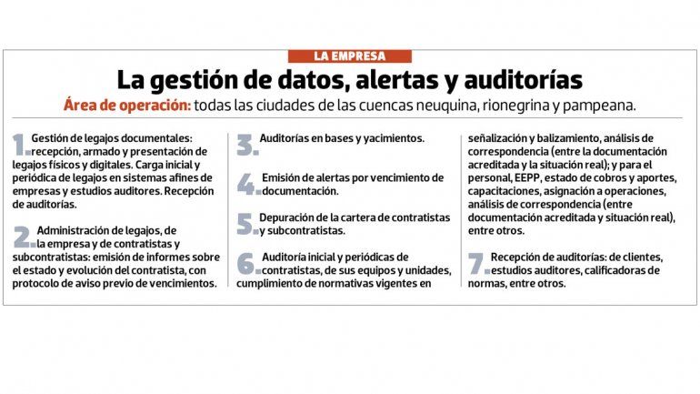 “Básicamente, la diferencia fundamental radica en que tanto yo como el resto las personas que trabajan conmigo tenemos conocimientos operativos en actividades de perforación y servicios. Es decir, sabemos con qué nos vamos a encontrar cuando vamos al campo ya sea en un equipo de perforación, workover, pulling, qué es y qué se utiliza en un DTM, una operación de perfilado, punzaje, estimulación ácida o hidráulica, coiled tubbing, wireline, etc.”, explica Gizzi, y aclara que el fuerte de la empresa es el armado de legajos, la presentación de carpetas, la carga en los sitios de los estudios auditores, la recepción de auditorías y el control de los subcontratistas.