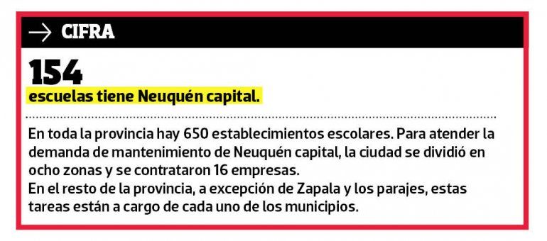 El gobierno provincial informó que las escuelas de la ciudad están en condiciones de iniciar el ciclo lectivo de manera normal. “Hoy no estamos atrasados con nada indispensable, puede ser que surja algo, pero tenemos las empresas y los equipos para arreglarlo”, indicó a LM Neuquén Ricardo Esteves, subsecretario de Obras Públicas, quien precisó que la metodología de mantenimiento cambió respecto de años anteriores, dado que las tareas no se realizan sólo en el receso sino a lo largo del ciclo lectivo, lo que permite llegar a tiempo con los trabajos.