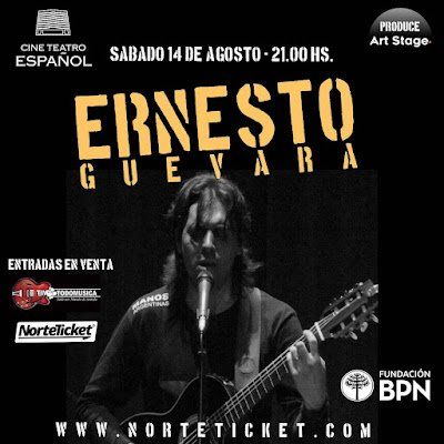- Ernesto Guevara en El Español. El cantautor tucumano se presentará en vivo este sábado en el Cine Teatro Español para grabar su tercer disco y su primer DVD. El show se podrá disfrutar de manera presencial y vía streaming. El recital contendrá un repertorio repleto de canciones de su obra y del cancionero popular argentino. Las entradas se pueden adquirir en la boletería del Teatro (Avenida Argentina 235) o en Todo Música.