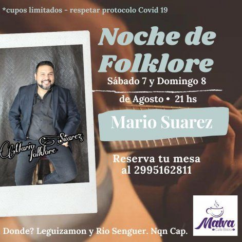 Cena show de Folklore. El salón de eventos Malva se reinventó durante la pandemia y está ofreciendo un show gratuito para quienes quieran ir a cenar. Mario Suarez será el músico invitado y desde las 21 horas comenzará el recital. No se cobra entrada, pero se pide reservar para poder tener una velada organizada. Será en Leguizamon y Río Senguer. Contacto: 299 5162811.