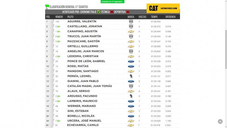 El piloto de Arrecifes dejó atrás a Jonatan Castellano y Agustín Canapino que completaron el segundo y tercer lugar. Juan Martín Trucco y Gastón Mazzacane -que había hecho el mejor tiempo el viernes- quedaron relegados al cuarto y quinto lugar en la clasificación general provisoria --aùn restaba las verificaciones deportiva y técnica- en vistas a la final que se correrá mañana a las 13:20.