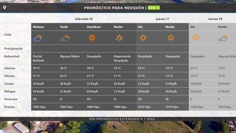 Desde la Autoridad Interjurisdiccional de las Cuencas (AIC), la máxima será de 29 grados y la mínima estará en los 21 grados por la mañana. Por la tarde, la máxima se trepará a los 34 grados y la mínima en los 21 grados. Hacia la noche. Descenderá a una máxima de 24 grados y una mínima de 17 grados. El cielo estará algo nublado por la mañana y soleado hacia el atardecer. El viento, proveniente del sector sudoeste, soplará a 52 kilómetros por hora y las ráfagas podrían llegar hasta los 72 kilómetros por hora.