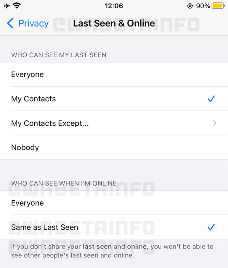 El estado de conexión en el momento (que indica si el usuario está conectado o no) es totalmente público). Eso ha permitido que algunas aplicaciones espíen datos de los usuarios. Según las capturas divulgadas por la fuente, las opciones de configuración para el estado en línea interactuarán con las de la hora de última conexión. Esto quiere decir, por ejemplo, que si en aquel apartado se elige “Nadie”, eso mismo se aplicará para el estado online.