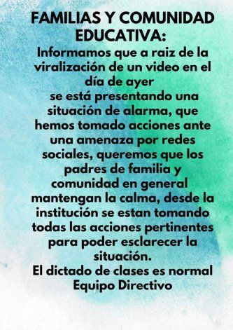 Esta mamá logró enviar una nota el mismo domingo a autoridades de Educación para alertar de esta situación y finalmente las autoridades de la escuela convocaron a una reunión para hoy. Allí nos aseguraron que habría rondines policiales para verificar que no haya problemas en los alrededores de la escuela y nos pidieron a cada una de las familias que revisemos las redes sociales de nuestros hijos.