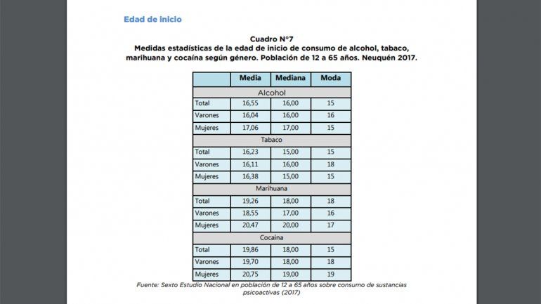 Además señalaron que la edad promedio de inicio en el consumo de sustancias psicoactivas se ubica entre los 16 y los 20 años, según la sustancia. Así, la droga de inicio en el consumo más temprano es el tabaco (16 años). Los varones se inician más temprano en el consumo de alcohol, tabaco y marihuana; y las mujeres lo hacen en el consumo de cocaína.