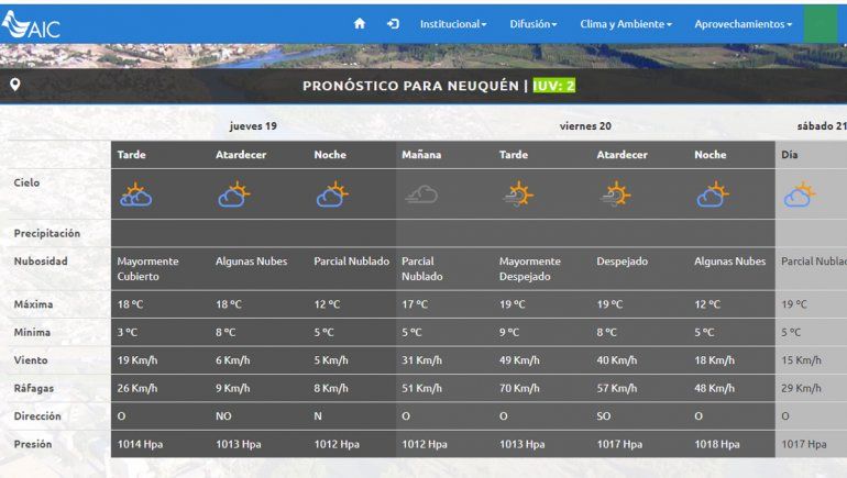 Para el Alto Valle se prevén para el viernes períodos de viento moderado a fuerte. De acuerdo a la AIC, las ráfagas podrían llegar a los 70 kilómetros por hora. Además, se pronosticaron períodos nubosos e inestables para el fin de semana. Lo bueno para las plantaciones de la región es que no se esperan heladas.