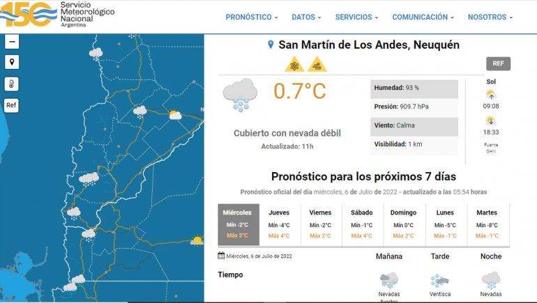 El Servicio Metrológico Nacional (SMN) emitió una alerta amarilla por viento y nieve en la zona de San Martín de los Andes en la que anticipa probabilidad de nevadas fuertes entre un 70 y 100%. Con periodos de ventisca y nevada durante el resto de la jornada.
