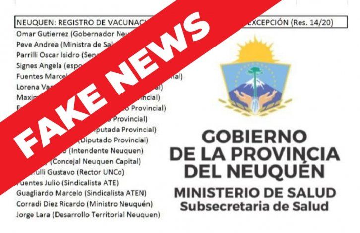 "A raíz de la divulgación de un supuesto registro de vacunaciones contra el Covid-19 en la provincia de Neuquén, en el que figuran diputados, ministros, senadores y concejales, entre otros, se comunica que el mismo es falso", recalcaron al inicio del comunicado.