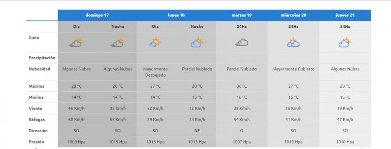 En su reporte el organismo pronóstico ráfagas durante la tarde que podrían alcanzar los 65 km/h con inestabilidad. Estas condiciones mejoran para la noche. La temperatura máxima podría alcanzar los 31°c.
