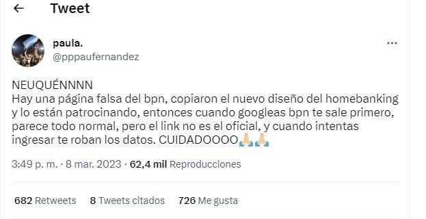 "Gente tengan cuidado cuando entren al nuevo homebanking del bpn, hay una página clonada que es idéntica a la del bpn", alerta otro vecino de la ciudad a través de un mensaje que ya se convirtió en viral.