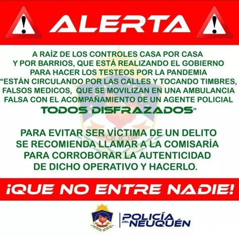 En caso de que alguien se presente en una ambulancia, o un policía quiera entrar al domicilio "llamen inmediatamente al móvil de la jurisdicción para verificar e identificar a esta persona", aseguró el vocero policial. Y resaltó: "Bajo ninguna circunstancia dejen entrar a nadie a los hogares. No existe excusa alguna para entrar a la casa.