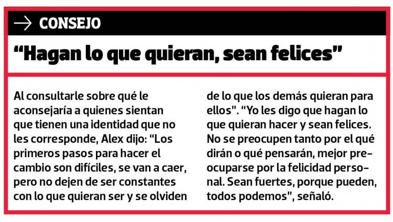 Alex ya piensa en continuar sus estudios en la Facultad de Psicología, mientras disfruta mucho de pintar, hacer actividades en una iglesia, dibujar y bailar hip hop y otros ritmos urbanos con el grupo de danza Fiction. “Yo me presento como un chico, ése soy yo, así me he sentido siempre, y es más fácil para el resto aceptarlo así. Porque decir chico trans puede resultarle chocante a otras personas”, aclaró.