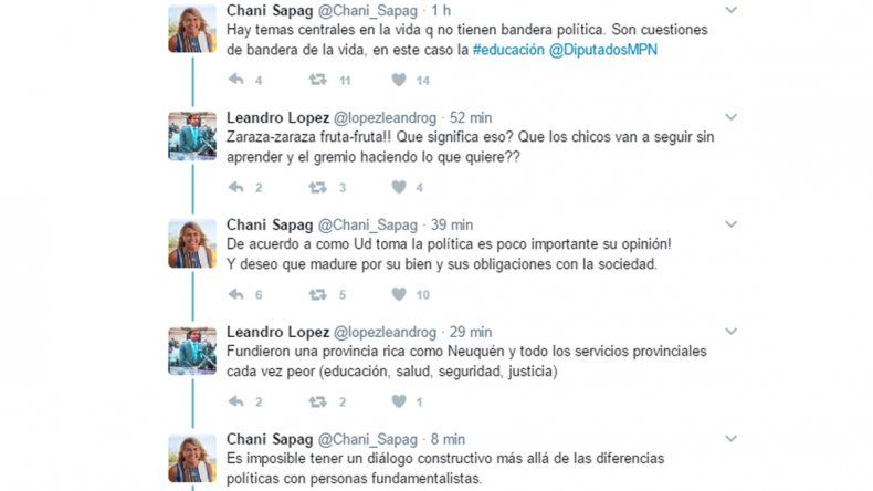 "Hay temas centrales en la vida q no tienen bandera política. Son cuestiones de bandera de la vida, en este caso la educación", lanzó inicialmente Sapag. "Zaraza-zaraza fruta-fruta!! Que significa eso? Que los chicos van a seguir sin aprender y el gremio haciendo lo que quiere??", le respondió López.