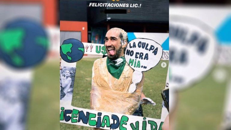 Se trata del estudiante Tomás Vidal que se disfrazó de mujer asesinada para festejar que se recibió de licenciado en Comercio Internacional en la Universidad Siglo 21. El joven se mostró envuelto en plástico, portando un pañuelo verde y una soga en el cuello con lo que lo arrastraban. Además, tenía un cartel con la consigna "La culpa no era mía".