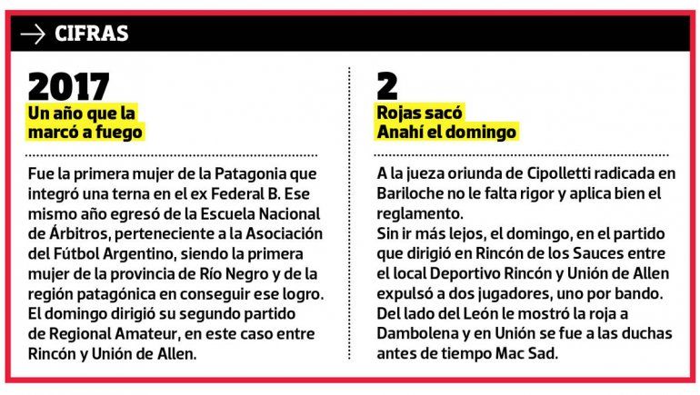 "Ser la primera mujer en la Patagonia en dirigir creo que es un gran paso, pero no solo en lo personal, sino para todas las árbitras de la zona", destaca Anahí, que no obstante asegura que su partido más importante fue el debut en Primera por la Liga de Bariloche, hace casi una década.