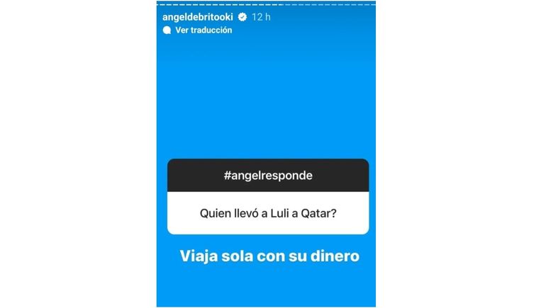 “¿Quién llevó a Luli a Qatar?”, le preguntaron al conductor en su clásica sección de Instagram llamada #ÁngelResponde. Lejos de darle vida a la polémica, el periodista salió en defensa de la modelo: “Viaja sola con su dinero”.