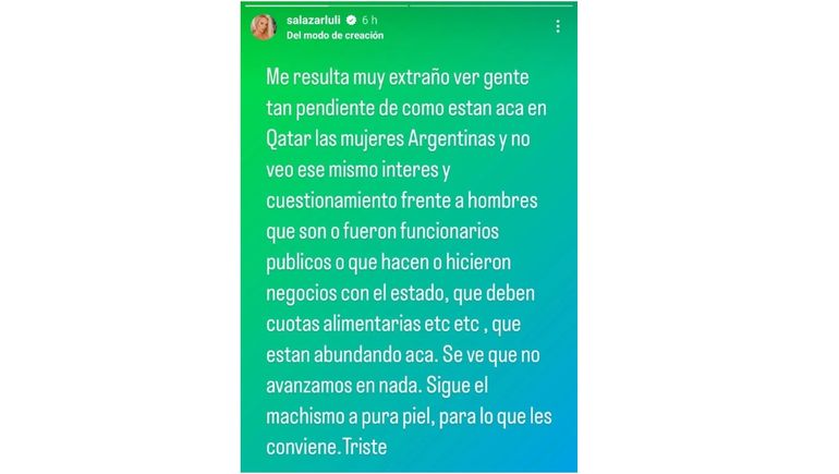 Enojada por los cuestionamientos, Luli Pop mostró su enojo desde las redes sociales. “Me resulta muy extraño ver gente tan pendiente de cómo están acá en Qatar las mujeres argentinas, y no veo ese mismo interés y cuestionamiento frente a hombres que son o fueron funcionarios públicos o que hacen o hicieron negocios con el Estado, que deben cuotas alimentarias, etc, etc, que están abundando acá. Se ve que no avanzamos nada. Sigue el machismo a pura piel, para lo que les conviene. Triste”, escribió en un largo comunicado.