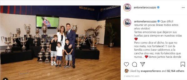 Junto a una foto de todos unidos, con los trofeos ganados por el '10' de fondo, completó: "Y con la familia como base saldremos a la cancha otra vez, más fortalecidos que nunca… Vamos juntos hacia donde sea, pero siempre hacia adelante!!!!! Te amo mi amor!!!".