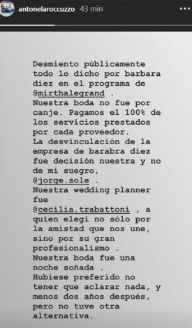 Y siguió: "Nuestra boda no fue por canje. Pagamos el 100% de los servicios prestados por cada proveedor". "La desvinculación de la empresa de Bárbara Diez fue decisión nuestra y no de mi suegro", remarcó.