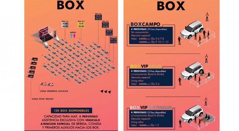 Los primeros box denominados Vip Platinium (los más cercanos al escenario) tienen un valor de $10.400 para cuatro personas. Esto incluye consumición de drink y food, living que consiste en mesa y sillones, y atención especial. Luego le sigue el box Vip Gold a un precio de $8.400 para cuatro personas, que incluye consumición de drink y food, y sillones tipo puf. Las más baratas son los box en el campo, a un precio de $6.400 por box ubicados desde las filas 5 a 8, y de $5.600 a los ubicados entre las filas 9 y 12. Estos lugares no tienen consumición ni accesorios, pero se permitirá que cada uno puedan ingresar con reposeras.