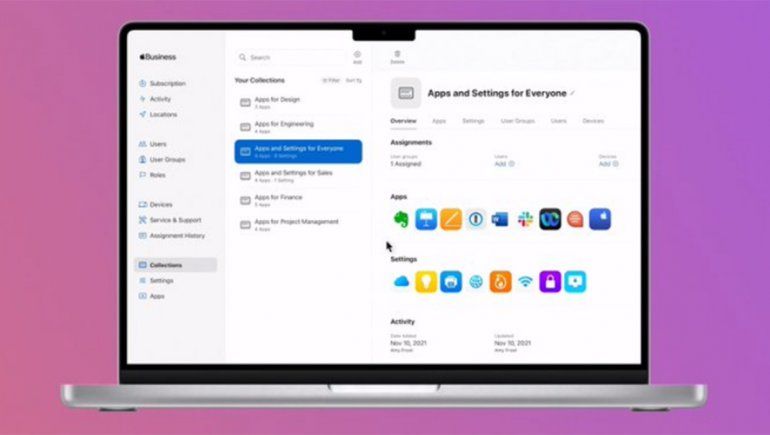 Apple Business Essentials permitirá a las empresas configurar los ajustes para individuos, grupos y dispositivos en función de las funciones de las pequeñas empresas. Por ejemplo, un equipo de marketing tendría un conjunto de aplicaciones para sus dispositivos con determinados permisos. Un equipo de gestión de proyectos tendría una configuración diferente. La capacidad de poner conjuntos de empleados en Colecciones acelera la incorporación y la distribución de aplicaciones corporativas.