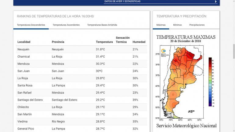 A las 17, el puesto que ostentaba la capital neuquina se ratificó y el termómetro subió a 32,2 grados centígrados, con un 19 por ciento de humedad. A las 18, subió a 32,5ºC.