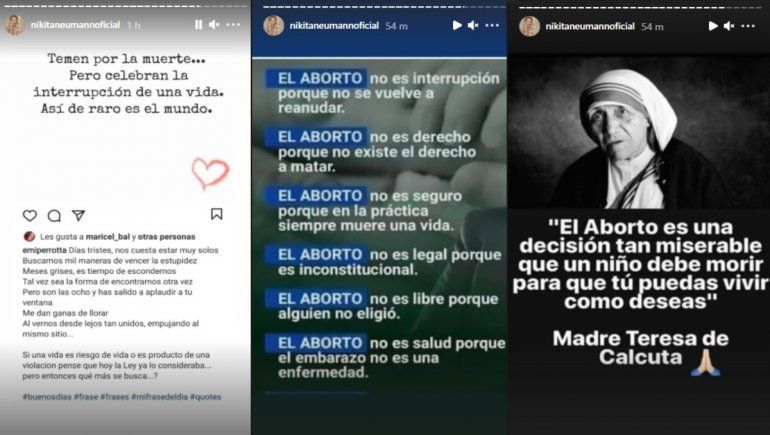 Nicolé Neumann, quien se manifestó en contra del aborto legal en varias oportunidades, también hizo su descargo a través de sus historias en Instagram.