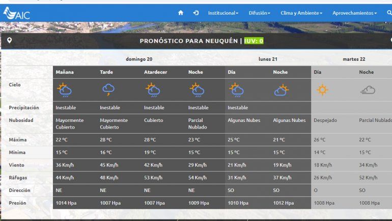 La Autoridad Interjurisdiccional de las Cuencas (AIC) adelantó tiempo inestable durante gran parte de la jornada de hoy con posibles tormentas hacia la tarde. El Servicio Meteorológico Nacional (SMN) pronosticó chaparrones durante la mañana y tarde con probabilidad de precipitaciones entre un 10% y un 40% y tormentas fuertes hacia la noche con probabilidad de lluvias entre un 40% y un 70%.