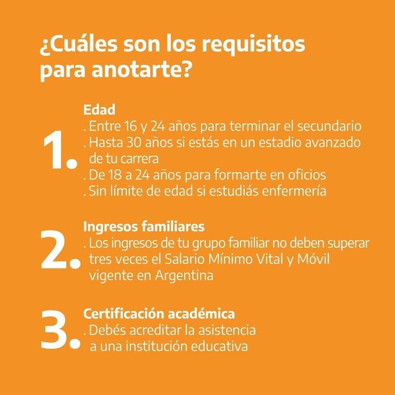 Quienes deseen acceder al beneficio deberán ser argentinas o argentinos nativa o con una residencia en el país no inferior a dos años. Además, tener entre 16 y 24 años para terminar el secundario y hasta 30 para aquellos que estén en un estado avanzado de sus carreras; entre 18 y 24 años para la formación en oficios; y sin límite de edad para aquellos que estudian enfermería. Para todos los casos, se deberá acreditar la asistencia a una institución educativa y los ingresos del grupo familiar no deberán superar tres veces el Salario Mínimo Vital y Móvil vigente en el país.
