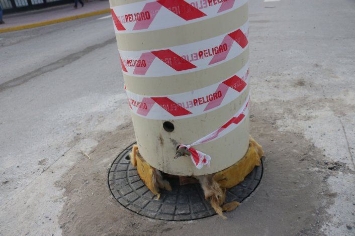 Esta situación se repite a dos cuadras, en la intersección de Chile y La Pampa, donde un arreglo similar en plena calle también fue señalizado con una termotanque en desuso y cintas de peligro.