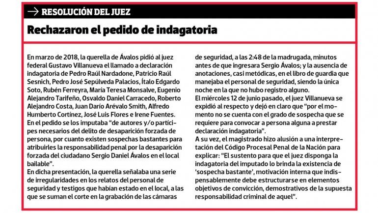 Todo el personal de Las Palmas pasó por distintas testimoniales, siempre negaron haber visto a Ávalos y nunca fueron indagados ni imputados en la causa.