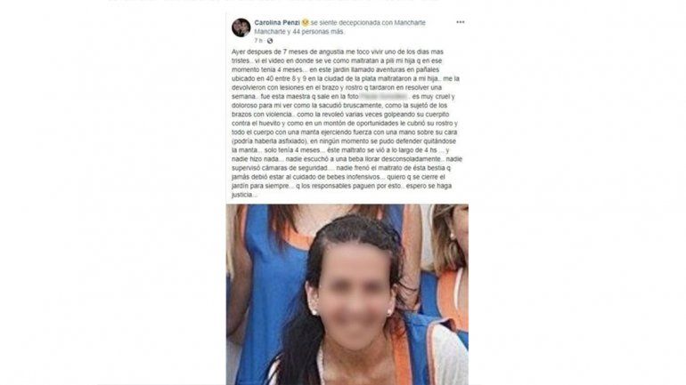 "Es muy cruel y doloroso para mi ver como la sacudió bruscamente, como la sujetó de los brazos con violencia, como la revoleó varias veces golpeando su cuerpito contra el huevito", señaló la madre en el posteo y remarcó que más de una oportunidad le devolvieron a su beba con “lesiones en el brazo y el rostro”.
