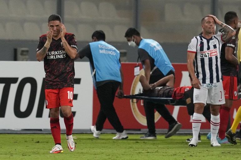 Las caras de los compañeros de Rojas reflejaron la gravedad de la lesión. El defensor salió en camilla de la cancha e incluso Marcelo Gallardo se acercó para darle fuerzas, mientras el jugador lloraba del dolor.