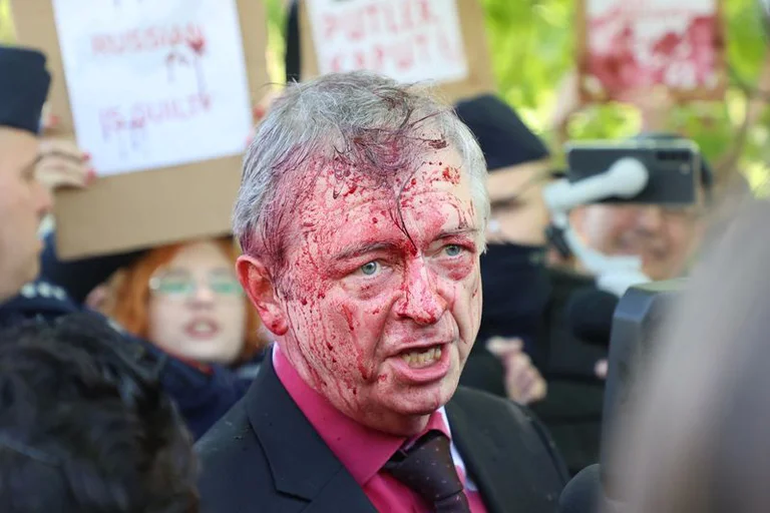 De inmediato, el embajador quedó teñido de rojo y mientras eso sucedía, detrás se visualizaban banderas ucranianas y se escuchaban cánticos contra Rusia. Minutos después se anunció que no resultó herido por la agresión.