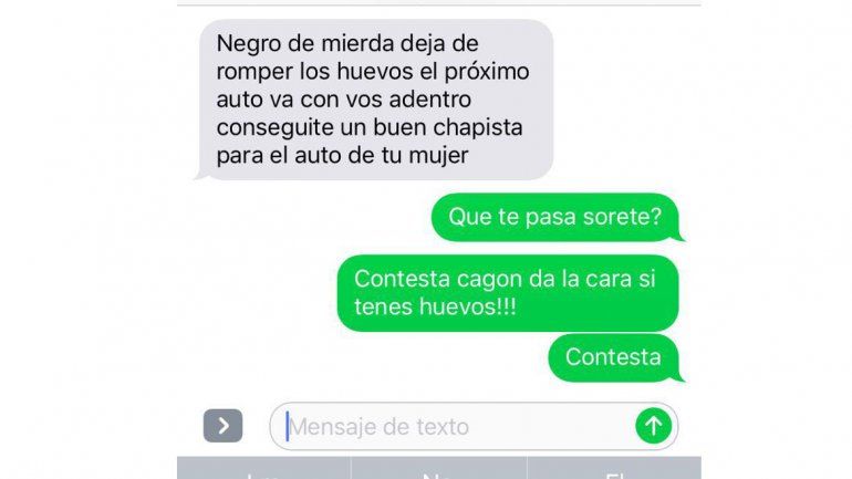 Pero la historia continuó esta mañana ya que, según denunciaron, Marillán recibió un mensaje de texto conteniendo una amenaza de muerte: “Negro de mierda dejá de romper los huevos, el próximo auto va con vos adentro conseguite un buen chapista para el auto de tu mujer”.