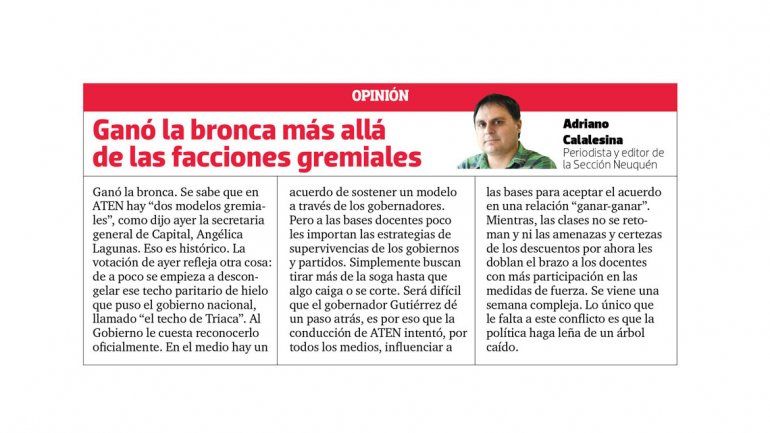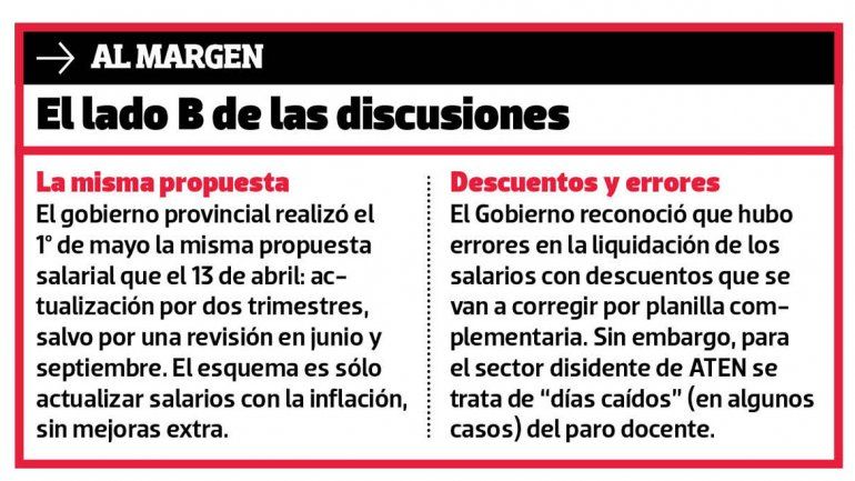 Este esquema redefine las estrategias del sindicato y el gobierno provincial, que hoy tiene a cuestas 27 días y no pagará el 6,3% de actualización salarial del trimestre, debido a que el sindicato docente no aceptó el acta acuerdo como los otros gremios estatales. En ATEN, ayer ganaron los “duros” y perdieron los “moderados”, aunque esa calificación, que define la histórica interna, es menor ante los resultados de las seccionales.