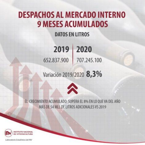 Además el INV, resaltó que se registró un aumentó en la venta de vino en botella tradicional de vidrio, botellas y damajuanas, y se dio una suba en el consumo "responsable" (medido) en los hogares y con las comidas durante 2020.
